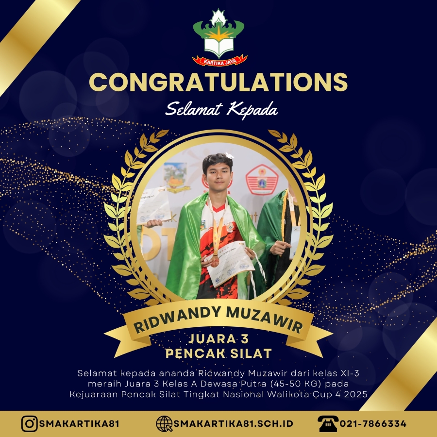 Ridwandy Juara 3 Pencak SilatRidwandy Juara 3 Pencak SilatSELAMAT KEPADA RIDWANDY MUZAWIR JUARA 3 KELAS A DEWASA PUTRA (45-50kg) Kejuaran PENCAK SILAT TINGKAT NASIONAL WALIKOTA CUP 4 tahun 2025