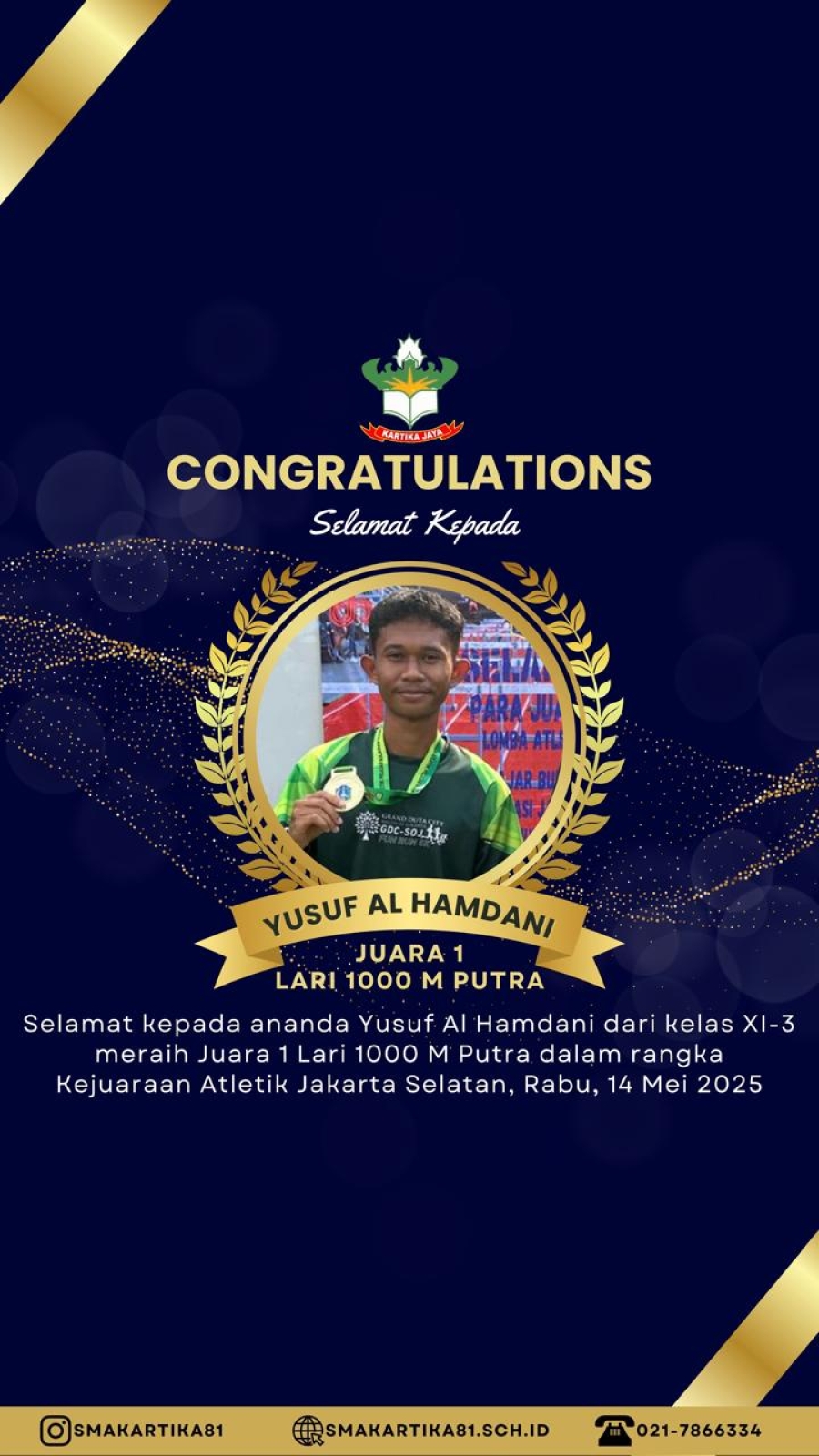 SELAMAT KEPADA YUSUF AL HAMDANI JUARA 1 LARI 1.000Meter PUTRA - KEJUARAAN ATLETIK JAKARTA SELATAN, RABU 14 MEI 2025.