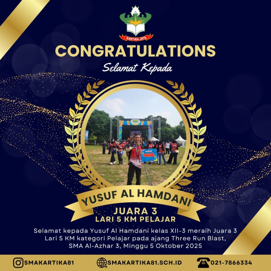 SELAMAT KEPADA - YUSUF AL HAMDANI - JUARA 3 LARI 5KM KATEGORI PELAJAR AJANG THREE RUN BLAST - SMA AL-AZHAR 3, MINGGU 5 OKTOBER 2025.